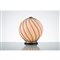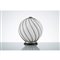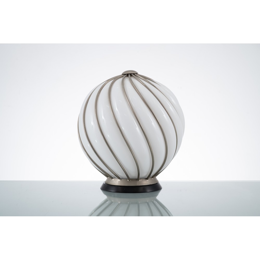 Lampada da tavolo “Loos” ad una luce, struttura in metallo cromato, diffusore sferico in vetro lattimo, base circolare nera.