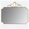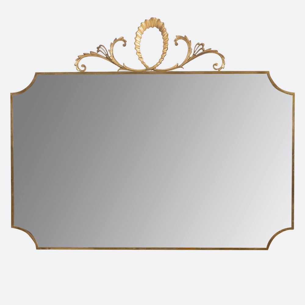 Specchio da parete con cornice sagomata in ottone, corpo rettangolare decorato con fregio a volute, cristallo specchiato.