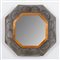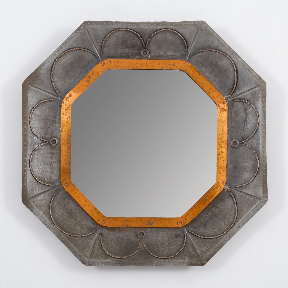 Specchio da parete ottagonale, cornice in metallo decorata con motivi geometrici e piattina di rame, decori a martello, cristallo specchiato.