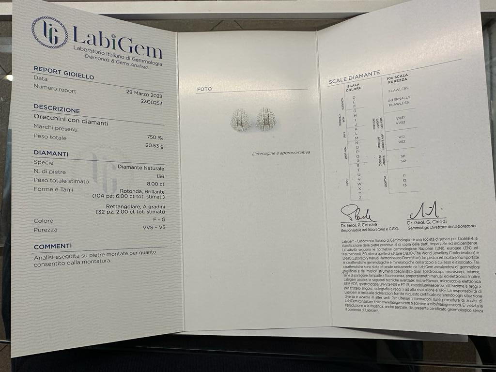 ORECCHINI IN ORO 18K CON 136 DIAMANTI PER UN TOTALE STIMATO DI 8 CARATI: 104 PEZZI TAGLIO BRILLANTE PER UN TOTALE STIMATO DI 6 CARATI + 32 PEZZI PER UN TOTALE STIMATO DI 2 CARATI – COLORE F-G PUREZZA VVS – VS – LABI5