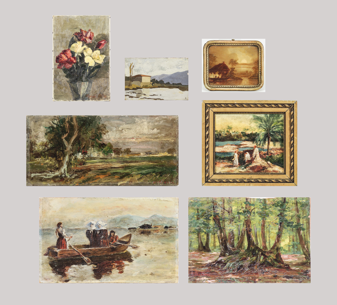 PAESAGGI E NATURA MORTA CON ROSE - LANDSCAPES AND STILL LIFE WITH ROSES raccolta di sette piccoli dipinti ad olio - seven oils tra cui uno di Osman Lorenzo De Scolari (7)