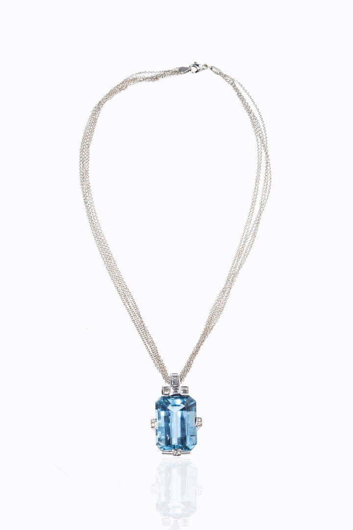 in oro bianco con al centro grade acquamarina di ct 36,80 ca e diamanti taglio brillante e baguette per totali ct 0,62 ca