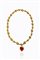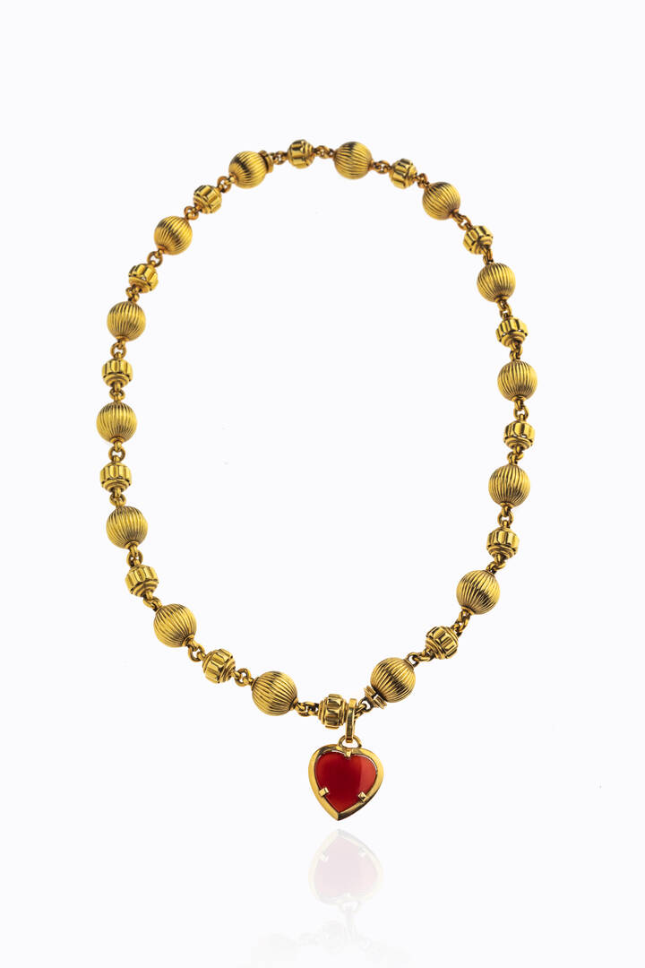 in oro giallo composto da sfere fesonate del diam di mm 10 ca alternate a sfere geometriche; al centro ciondolo con cuore in corniola