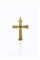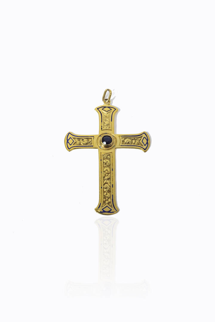 in oro giallo a forma di croce incisa con motivi floreali. Al centro zaffiro sintetico taglio rotondo.