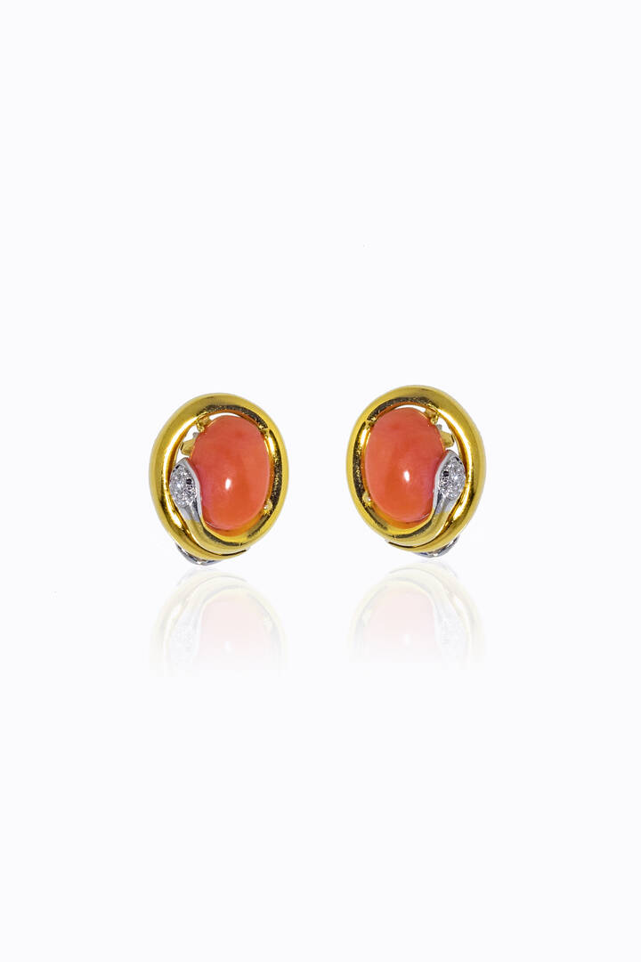 in oro giallo e bianco, a clip, di forma ovale, con al centro corallo mediterraneo taglio ovale cabochon nei toni del salmone e piccoli diamantini taglio 8/8 per totali ct 0,15 ca