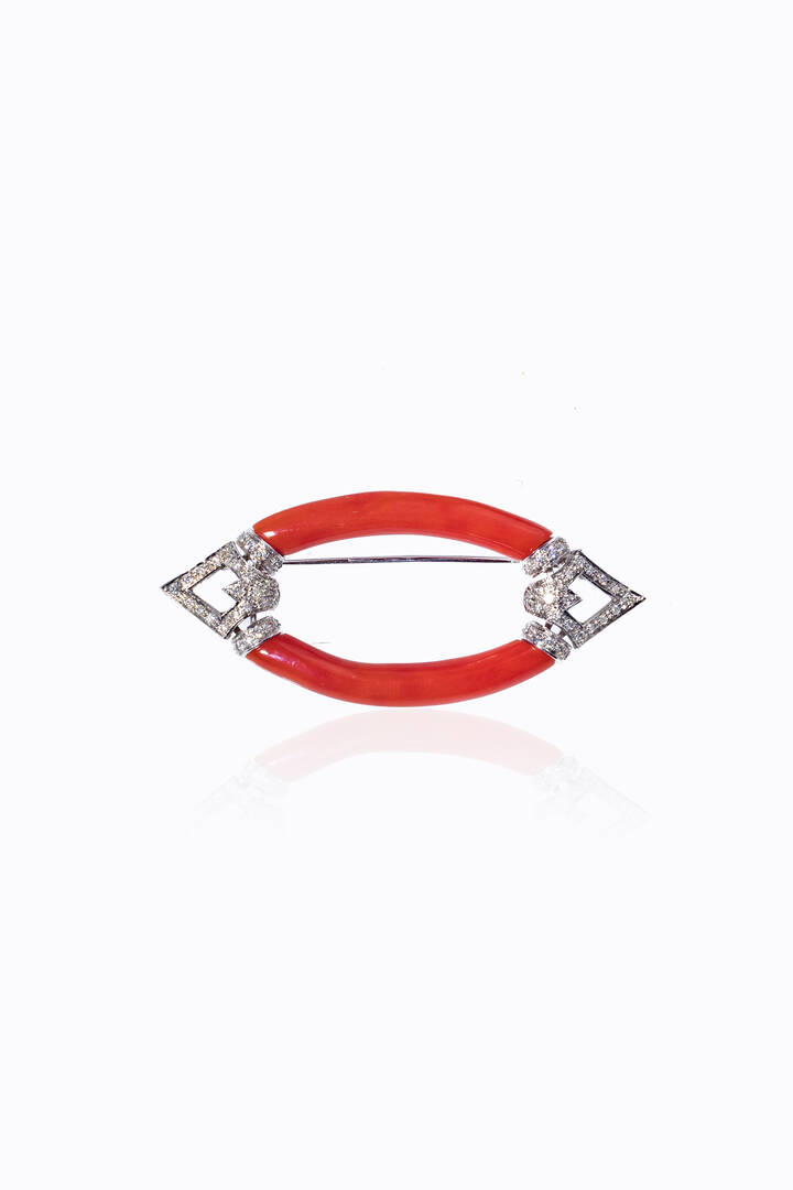 in oro bianco, a forma di losanga, con inserti in corallo rosso mediterraneo e diamanti taglio brillante per totali ct 0,30 ca
