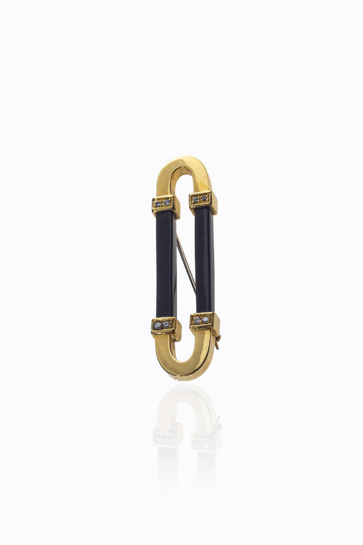 in oro giallo e onice, a forma di anello ovalizzato. Quattro diamanti taglio brillante a decoro