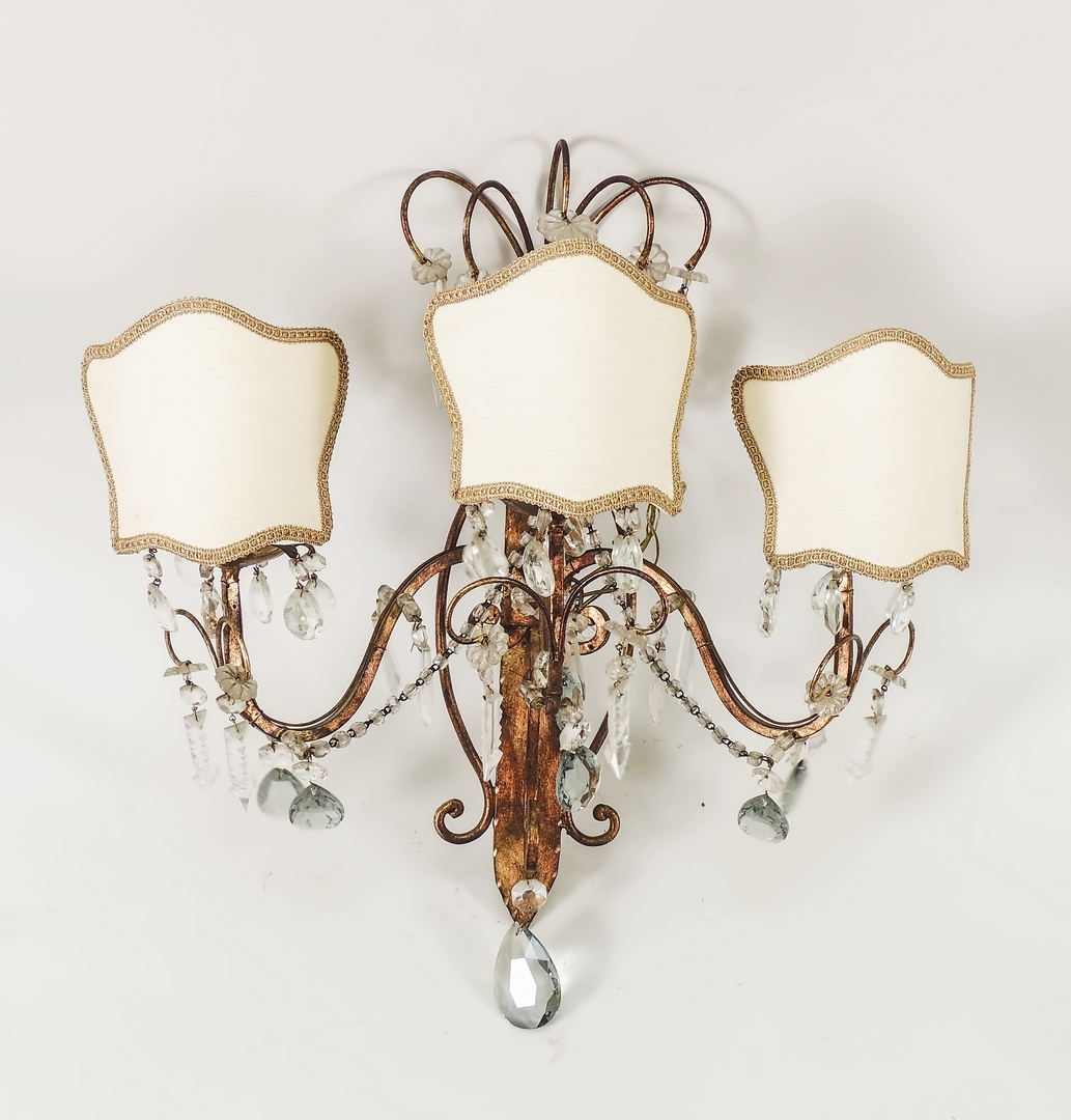 COPPIA APPLIQUES IN BRONZO DORATO - PAIR OF GILDED BRONZE WALL LAMPS tre bracci a doppia voluta, pedenti in cristallo, con ventole