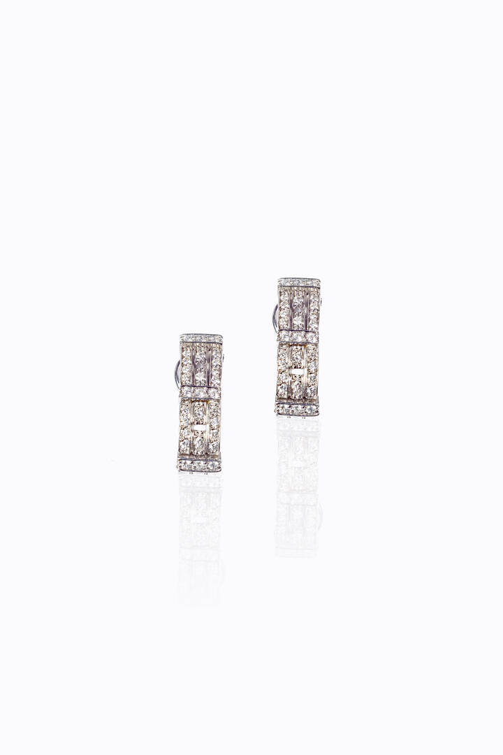 Coppia di orecchini in oro bianco, firmati "Chimento", a cerchio ovalizzato; sul fronte lavorazione "a greca" con diamanti taglio brillante per totali ct 0,50 ca, probabile colore G-H, purezza IF-VVS