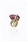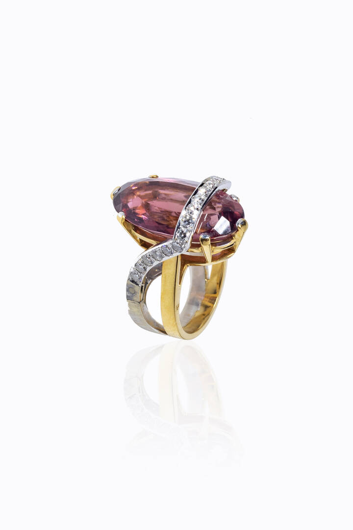 Anello in oro giallo e bianco, firmato "Cirio-Torino" con tormalina rosa taglio ovale e diamanti taglio 8/8 per totali 0,60 ca