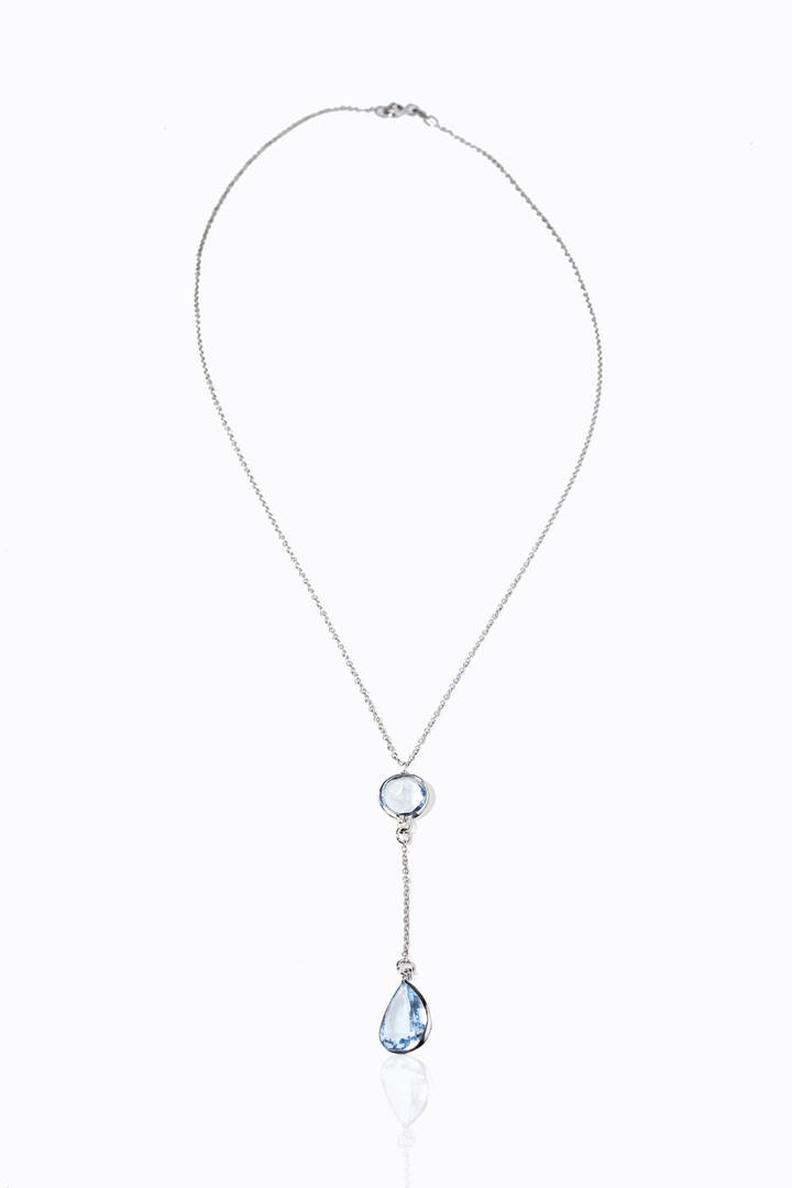 in oro bianco con due acquamarine taglio rotondo e a goccia pendenti