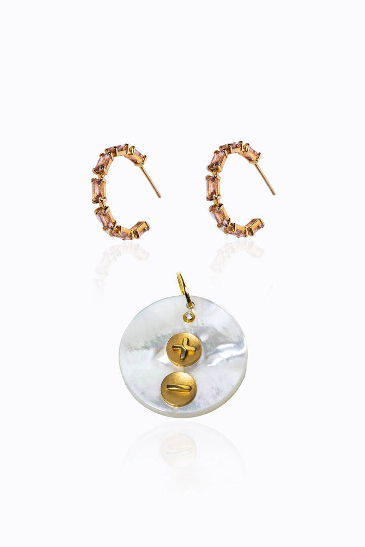 -ciondolo in madreperla con inserto in oro recante la scritta "Più di ieri meno di domani". Peso gr 3,9