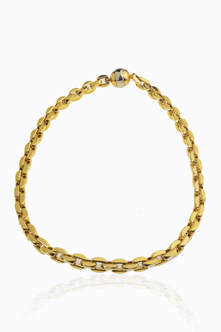 Girocollo in oro giallo e bianco, firmato "Barakà", lavorato a maglia geometrica. Chiusura a sfera