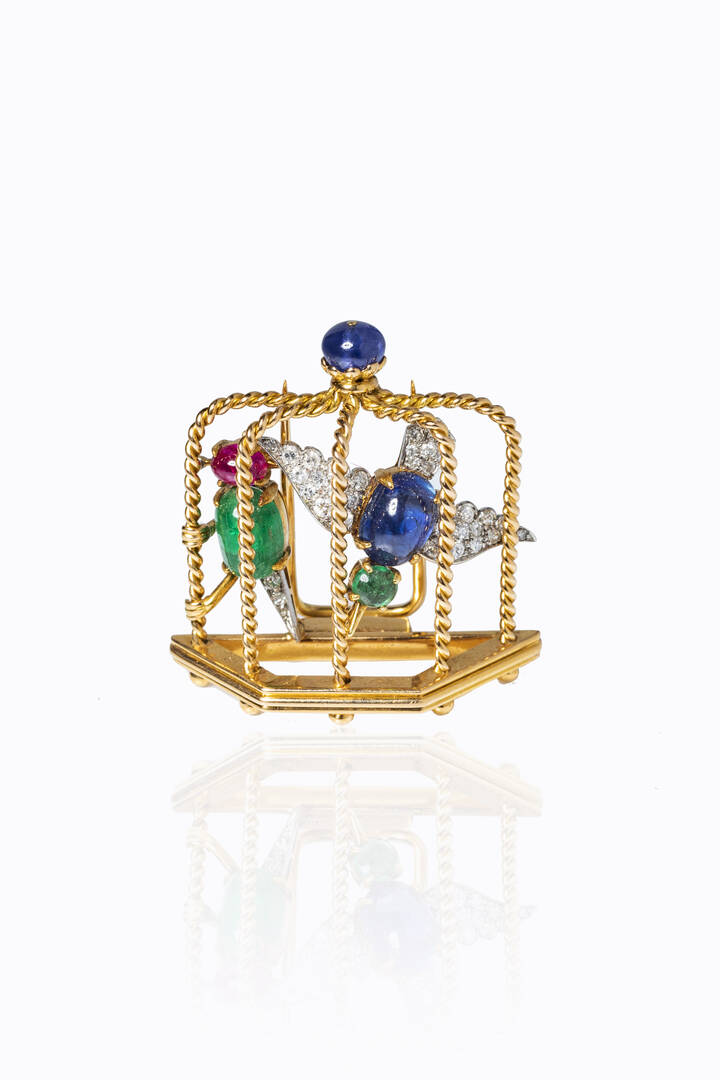 in oro rosa, anni ’60, a forma di piccola gabbia con all’interno due uccellini: corpi con