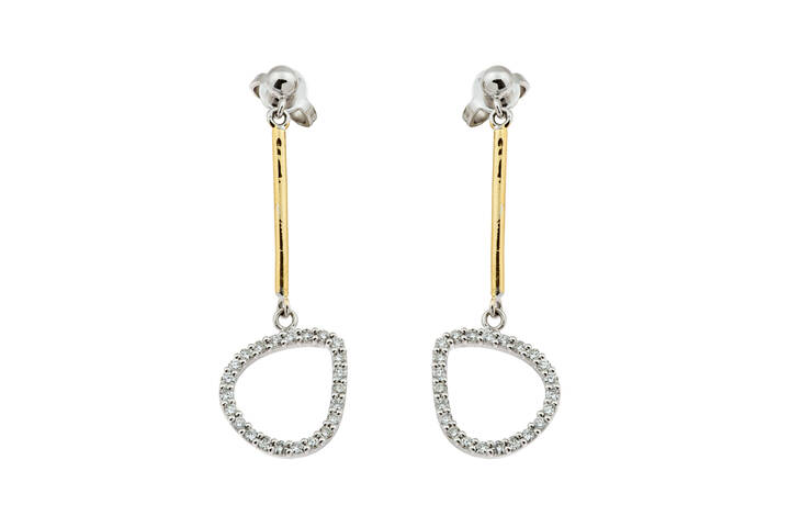 in oro bianco e giallo composti da barrette terminanti con diamanti taglio brillante per totali ct 0,43 ca, probabile colore G-H, purezza IF-VVS