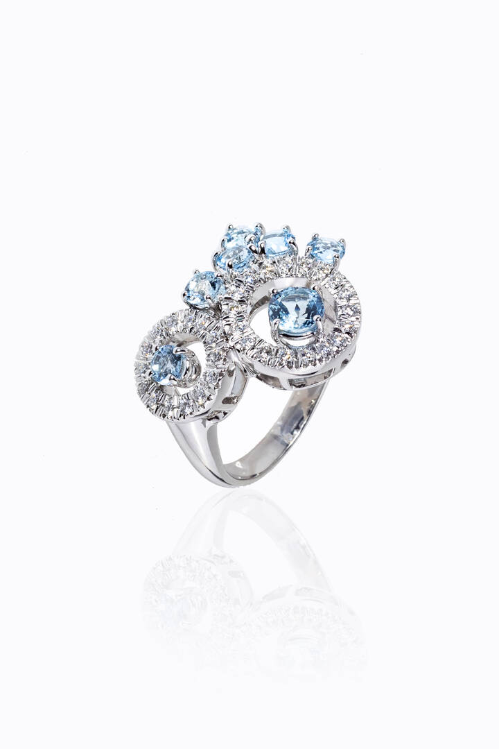in oro bianco, sommità con cerchi in diamanti taglio brillante per totali ct 0,41 ca, probabile colore G-H, purezza IF-VVS e acquamarine taglio rotondo per totali ct 1,36 ca