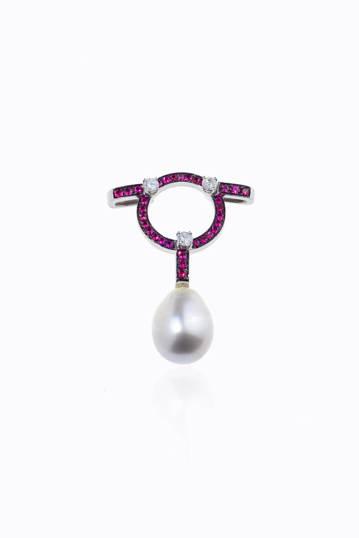 in oro bianco e brunito, con zaffiri rosa per totali, diamanti taglio brillante per totali ct 0, 55 ca, terminante con una perla australiana a pera del diam. di mm 14,7
