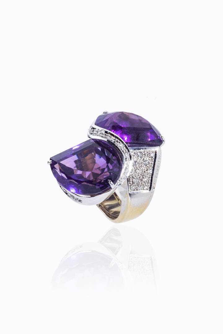in oro giallo e bianco, modello contrarié, con due grandi ametiste taglio fantasia e diamanti taglio brillante per totali ct 0,60 ca