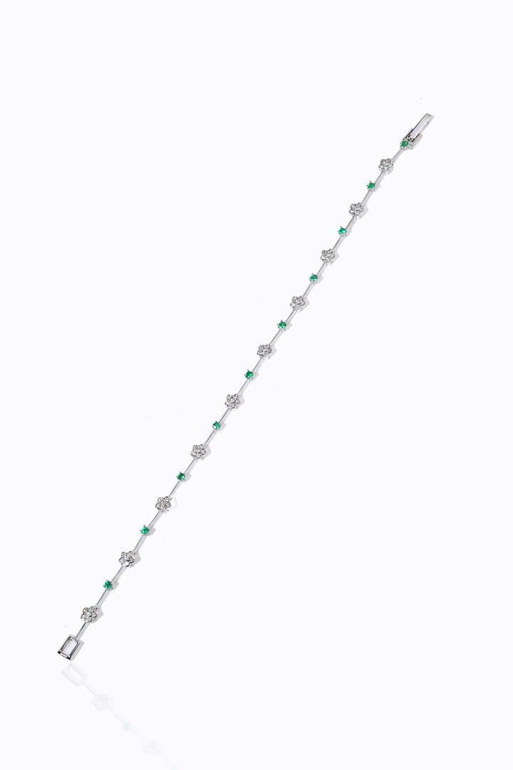 in oro bianco, composto da segmenti rigidi con smeraldi taglio rotondo per totali ct 0,31 ca, alternati a diamanti taglio brillante per totali ct 0,33 ca, probabile colore G-H, purezza IF-VVS