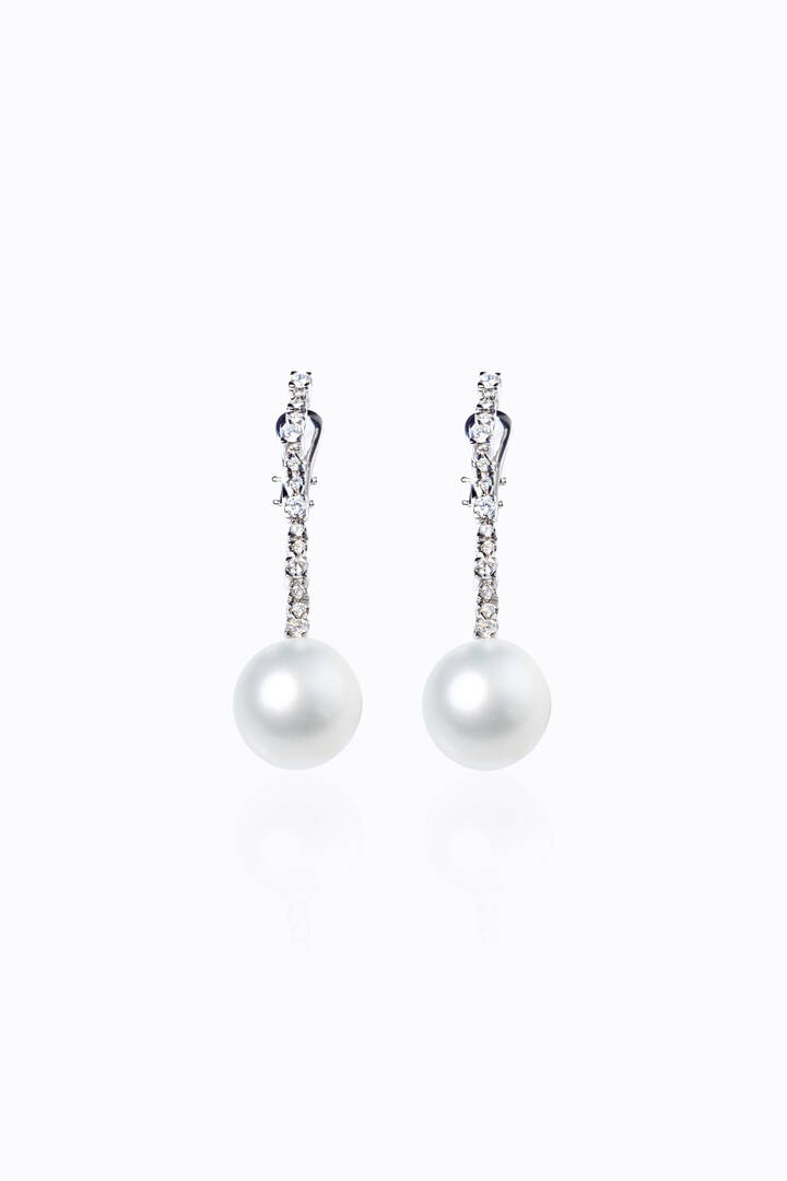 in oro bianco, corpo in diamanti taglio brillante per totali ct 0,90 ca, probabile colore G-H, purezza IF-VVS, terminanti con due perle australiane del diam. 13,2 mm
