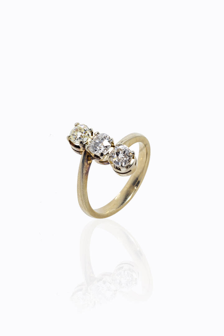 in oro bianco, modello trilogy, con tre diamanti di vecchio taglio disposti verticalmente per totali ct 1,10 ca