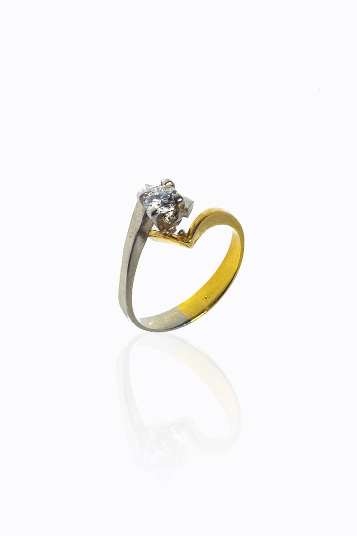 in oro giallo e bianco, sommità con castone geometrico trattenente un diamante solitario taglio brillante di ct 0,30 ca