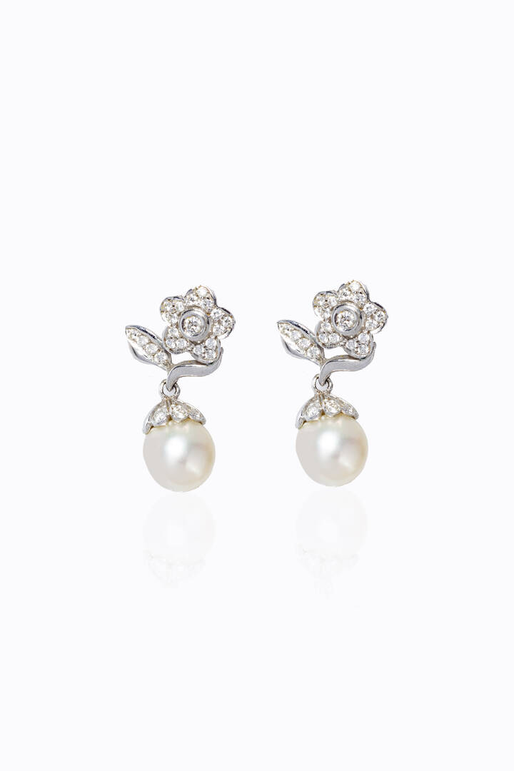 in oro bianco con corpo composto da fiori in diamanti taglio brillante per totali ct 0,35 ca; terminanti con due perle giapponesi del diam. di mm 8 ca.