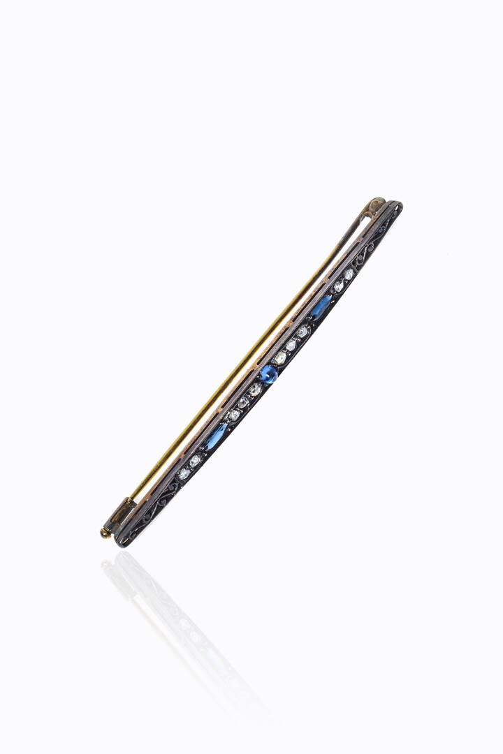 in oro a bassa caratura ed argento, a barretta, con zaffiri cabochon e navette e rosette di diamanti per totali ct 0,50 ca