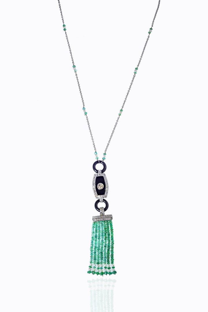 in oro bianco, con perline e smeraldi sfaccettati; al centro pendente con dischi in onice e centrale con diamanti di vecchio e 8/8 per totali ct 1,0 ca, terminante con frange in smeraldi sfaccettati.