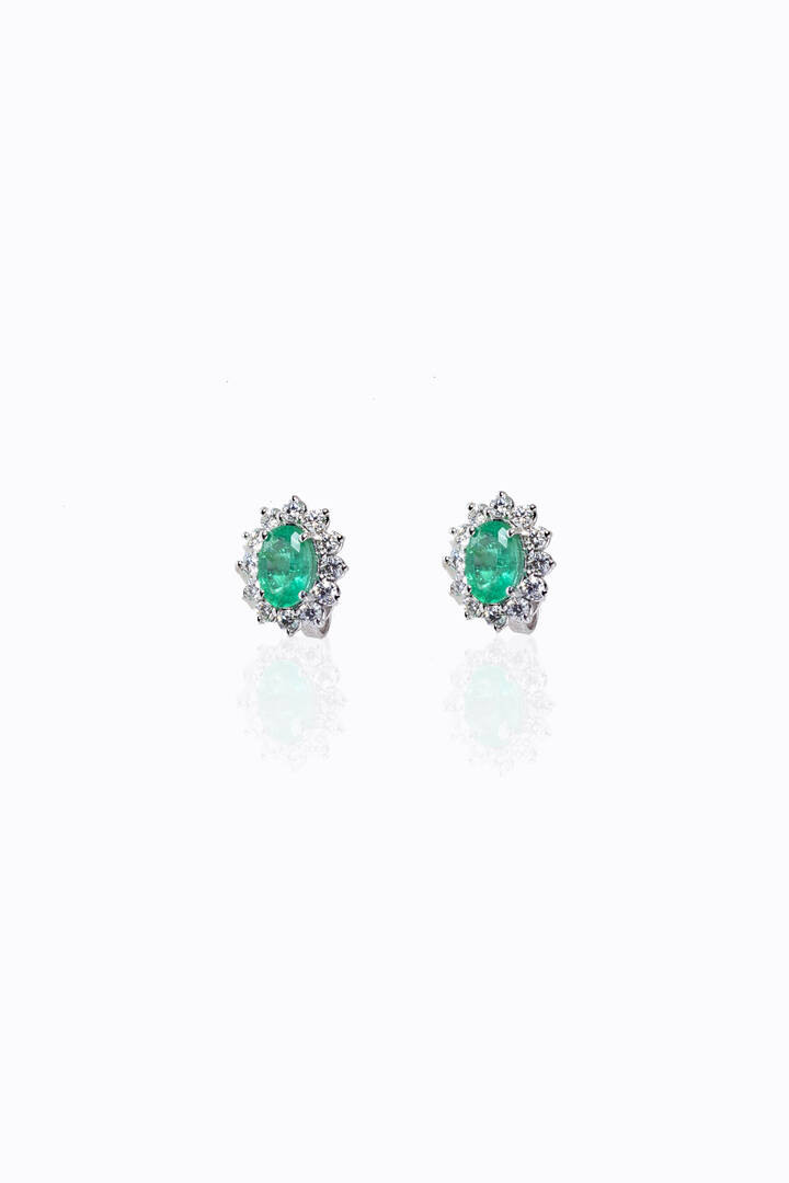 in oro bianco, a lobo, con due smeraldi taglio ovale per totali ct 1,51, contornati da diamanti taglio brillante per totali ct 0,65 ca, probabile colore G-H, purezza IF-VVS