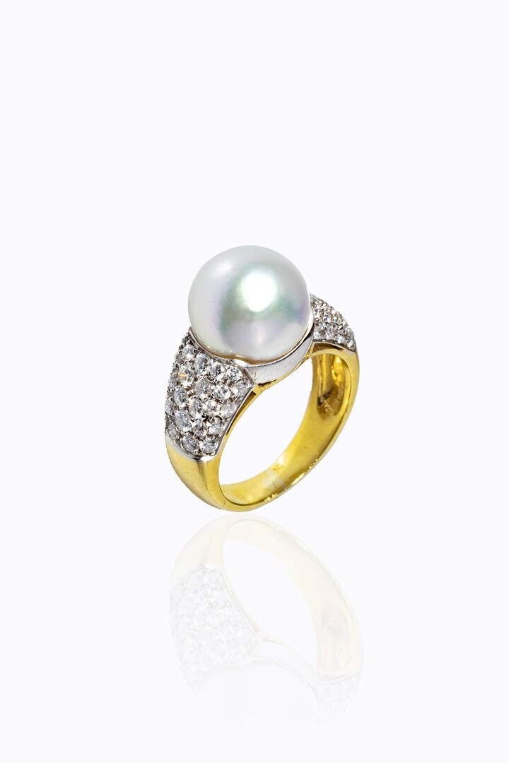 in oro bianco e giallo, sommità con al centro una perla australiana del diam. di mm 10.7 ca e ai lati diamanti taglio brillante per totali ct 1,0 ca.