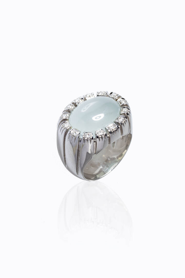 in oro bianco, sommità con acquamarina milk taglio cabochon, contornata da diamanti taglio brillante per totali ct 0,26 ca, probabile colore G-H, purezza IF-VVS