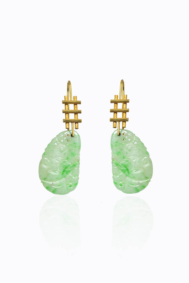 in oro giallo satinato; ad amo, con elementi geometrici terminanti con due gocce in giada traforata ed incisa