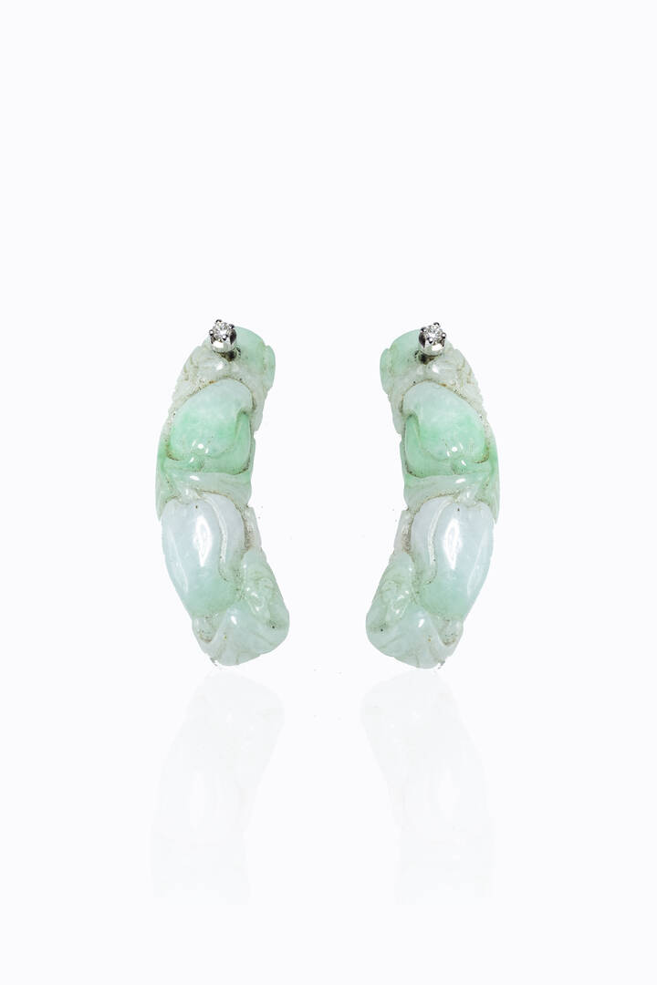 in oro bianco con due elementi in giada incisi a motivi bene augurali di zucca.