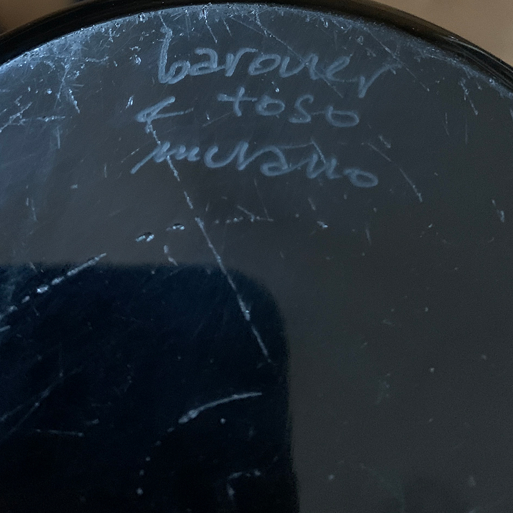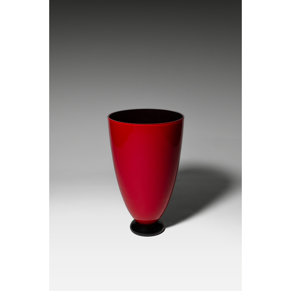 Vaso in vetro incamiciato rosso con piede applicato in vetro nero. Firma incisa: Barovier & Toso Murano