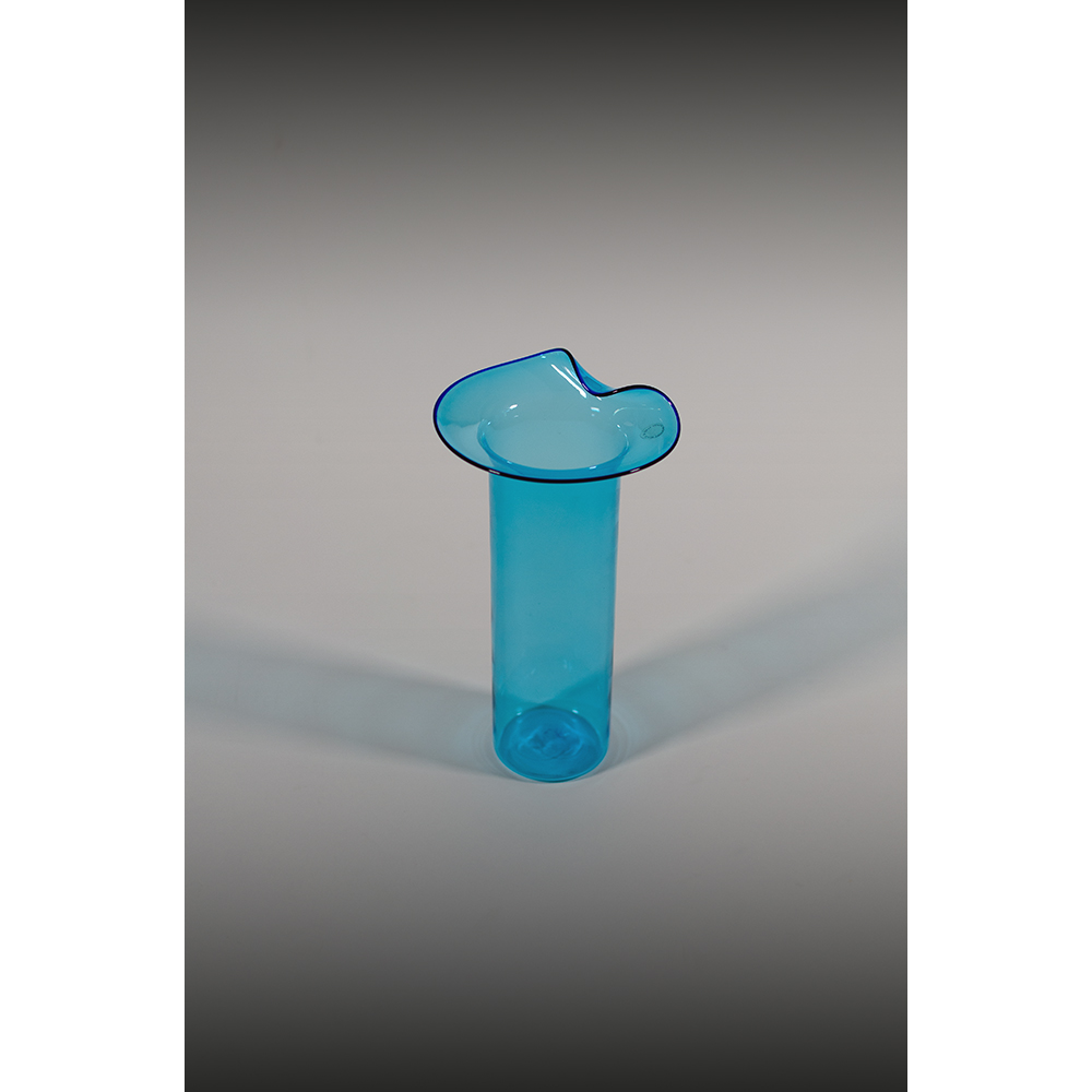 Vaso in vetro della serie “Svolazzi” in vetro azzurro con bocca irregolare e filo blu applicato, 1987.