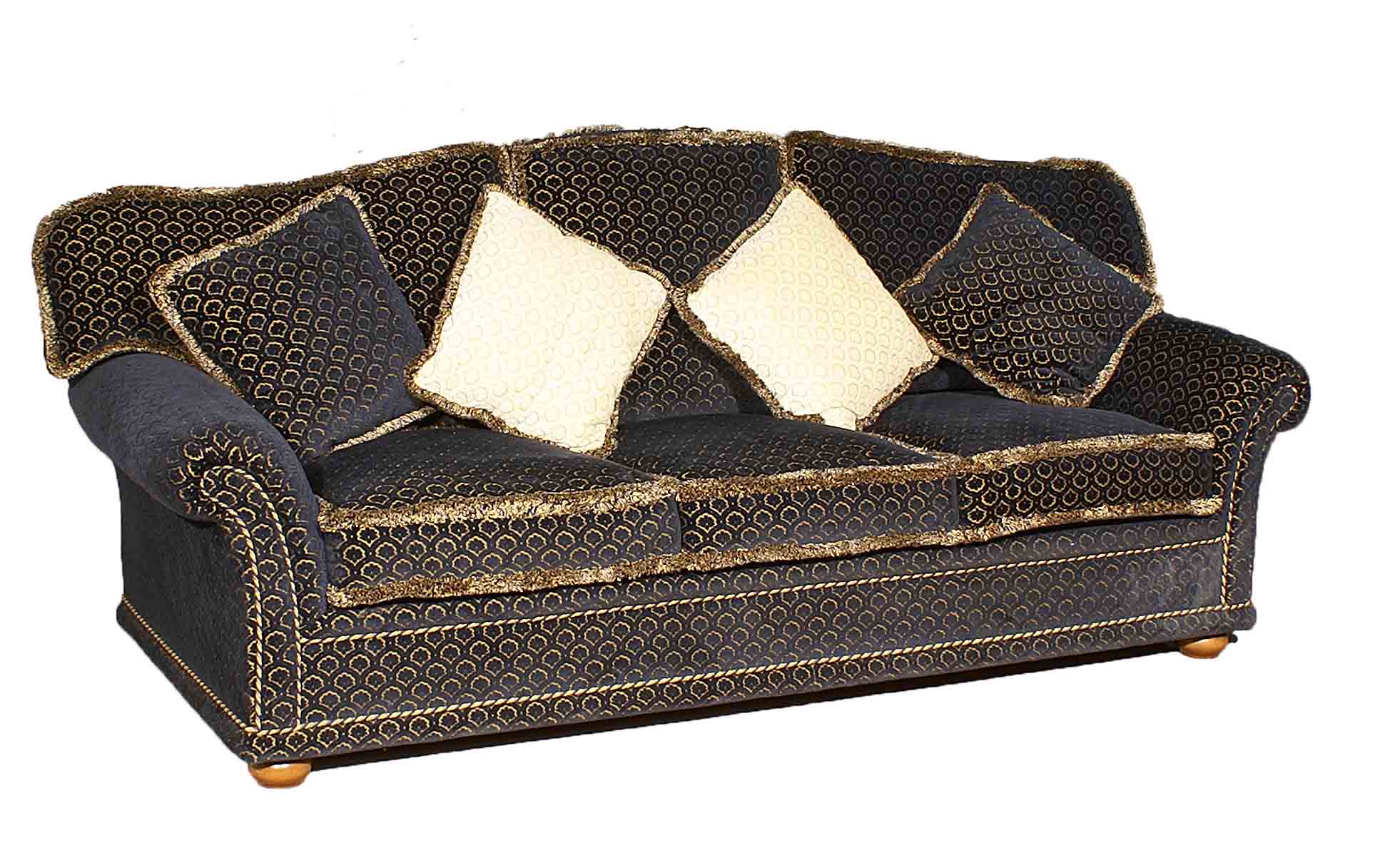 Divano a tre posti, interamente imbottito e rivestito in tessuto, cm. 83x225x90.