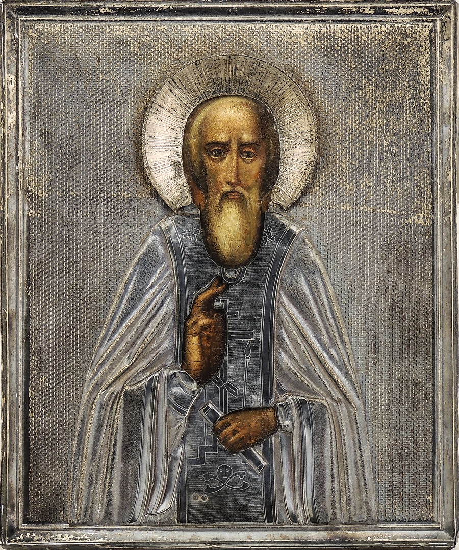 ICONA - ICON Mosca - Moscow, Aleksandr Sergeev Egorov, 1877 raffigurante San Nicola, ritza in argento cm 26,5x22 Punzoni: reca punzone città di Mosca, punzone argentiere con data, punzone assaggiatore Viktor Savinkov