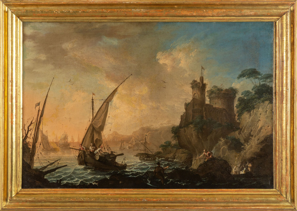 Scuola francese II metà sec.XVIII 'Veduta costiera con velieri e torre' olio