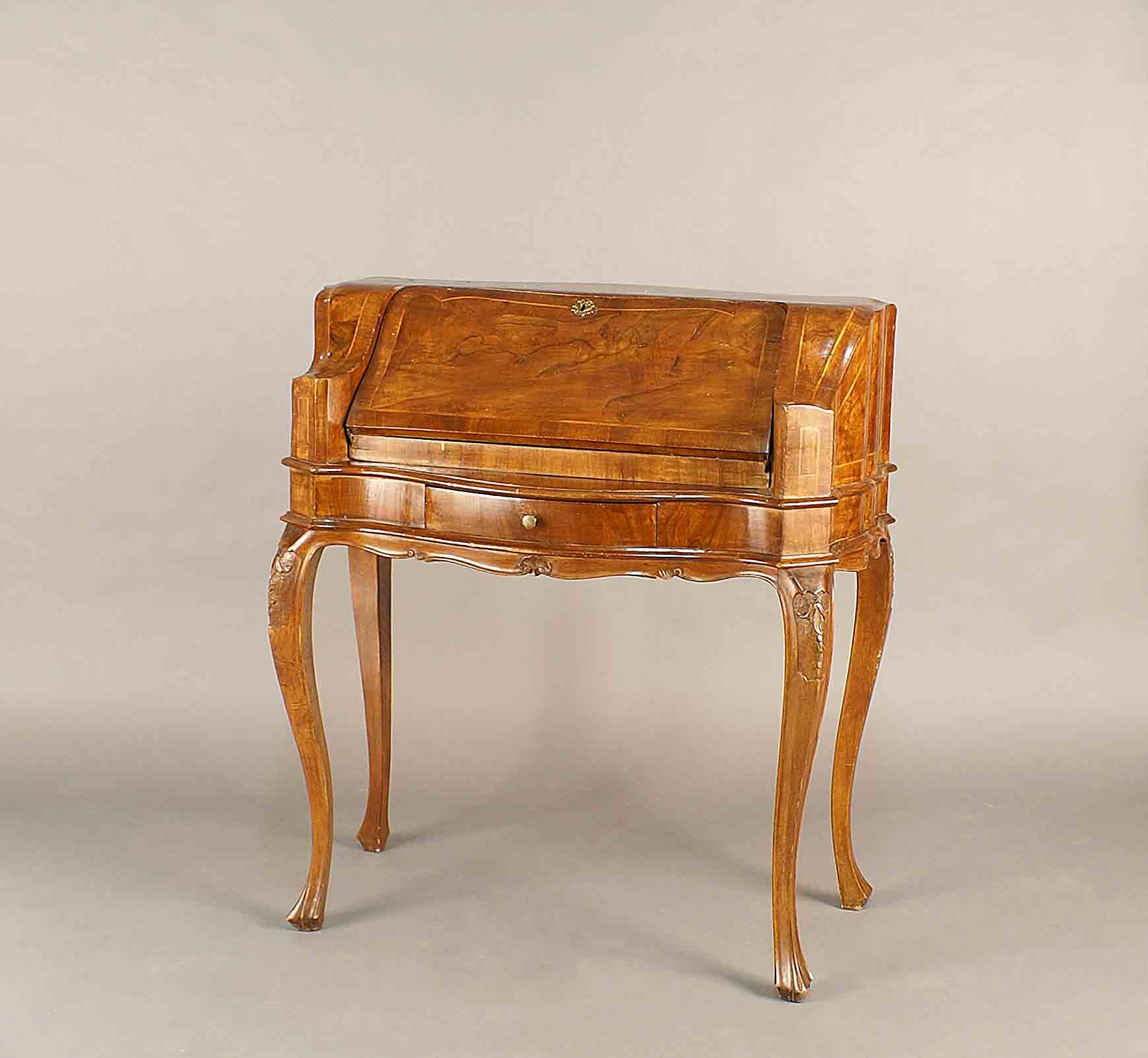 Mobile scrittoio in noce filettato in legno di bosso, fronte con un cassetto sottostante, gambe di linea mossa, vecchia manifattura, cm. 97x90x47.