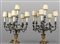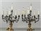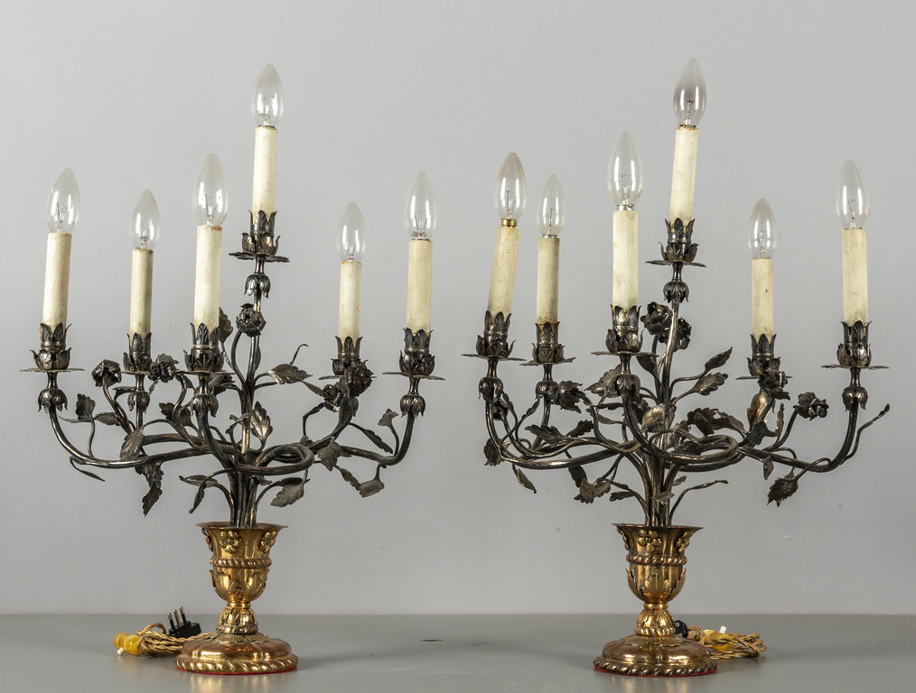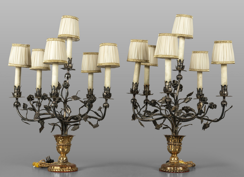 Coppia di candelabri a sei luci in rame argentato e dorato raffigurante tralci di fiori