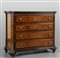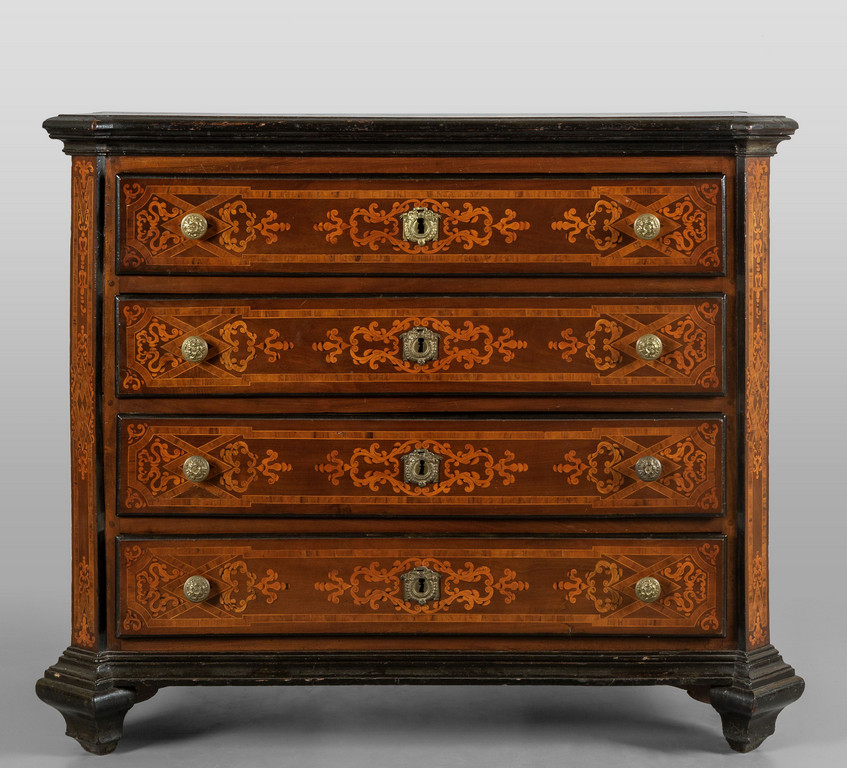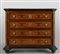 Canterano in noce intagliato a formelle quattro cassetti di cui il primo ribaltabile a scrittoio Lombardia sec.XVII