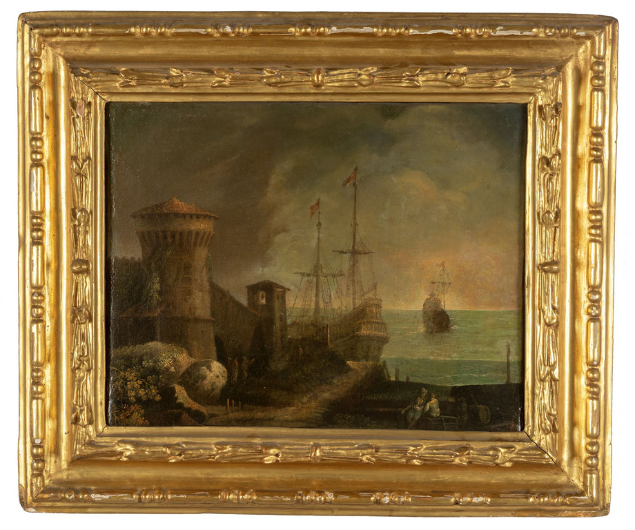 Scuola italiana sec.XVIII 'Marina con porto e vascelli' olio cornice coeva in legno intagliato e dorato