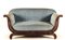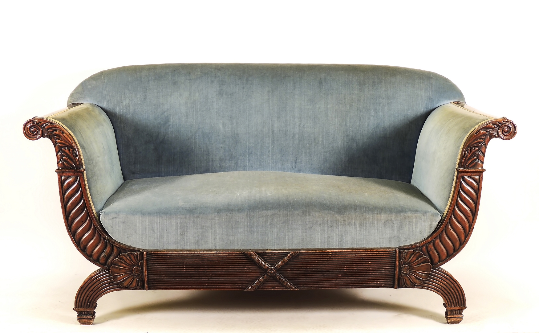 DIVANO A BARCA IN NOCE - WALNUT SOFA prima metà del XIX secolo - first half of 19th Century braccioli rovesciati intagliati con foglie d'acanto e motivi a torciglione, pendaglina scanalata con finali a palmetta, piedi a faldistorio, rivestito in velluto azzurro h cm 90x167x60