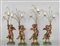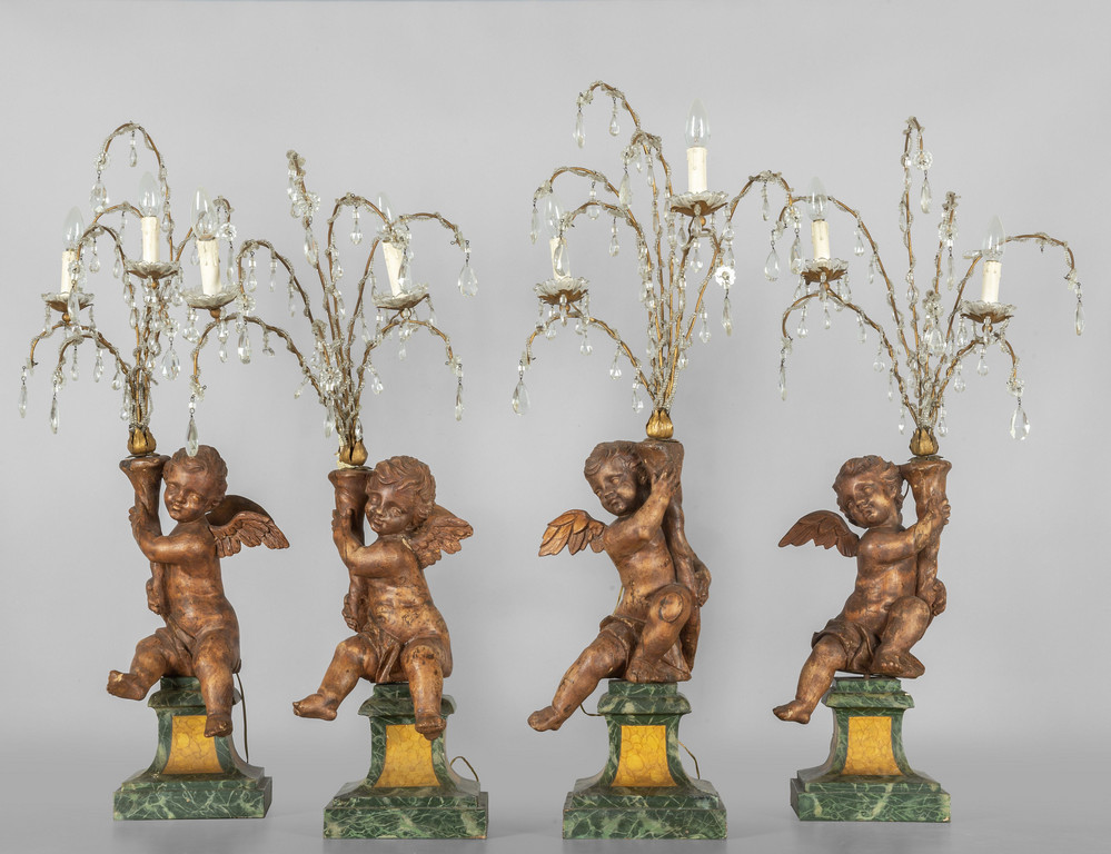 Quattro putti portaluce in legno poggianti su basi laccate a finto marmo che sorreggono due luci ricca decorazione in cristallo