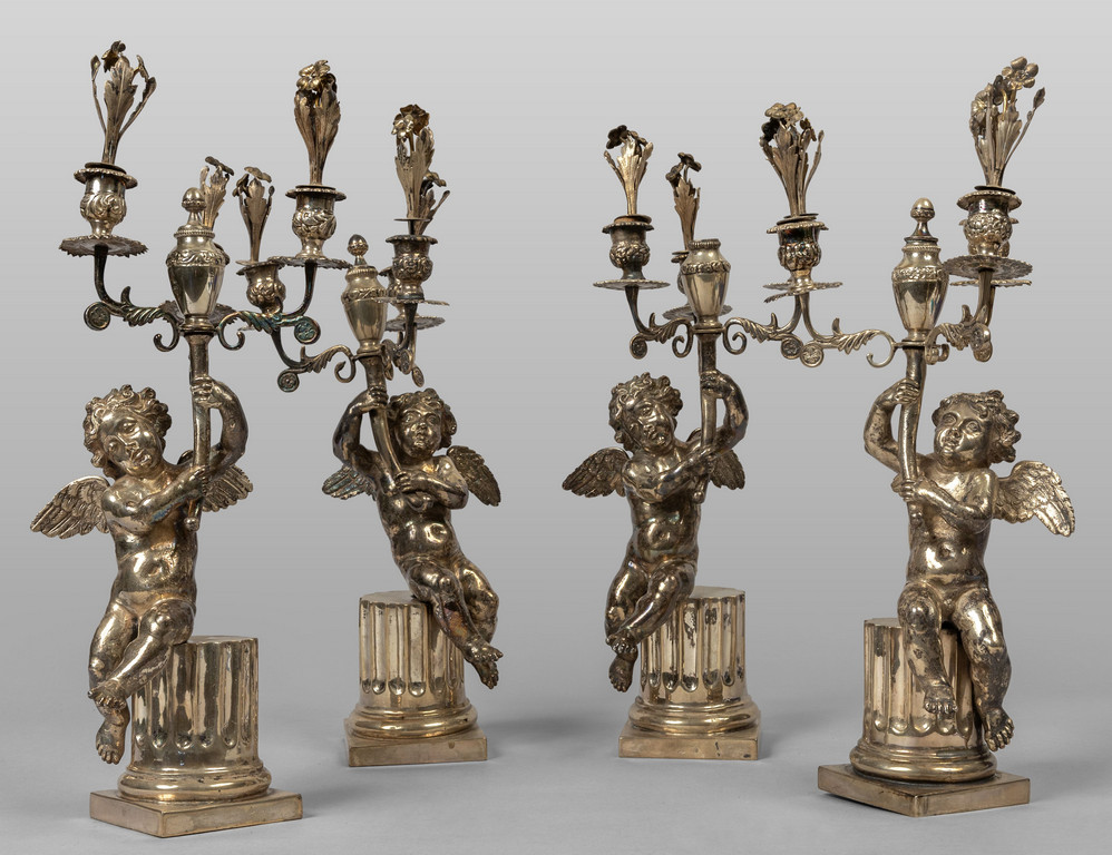 Quattro candelieri in argento raffiguranti putti che sorreggono un vasetto con tre bracci (uno senza coperchio) poggianti su una colonna