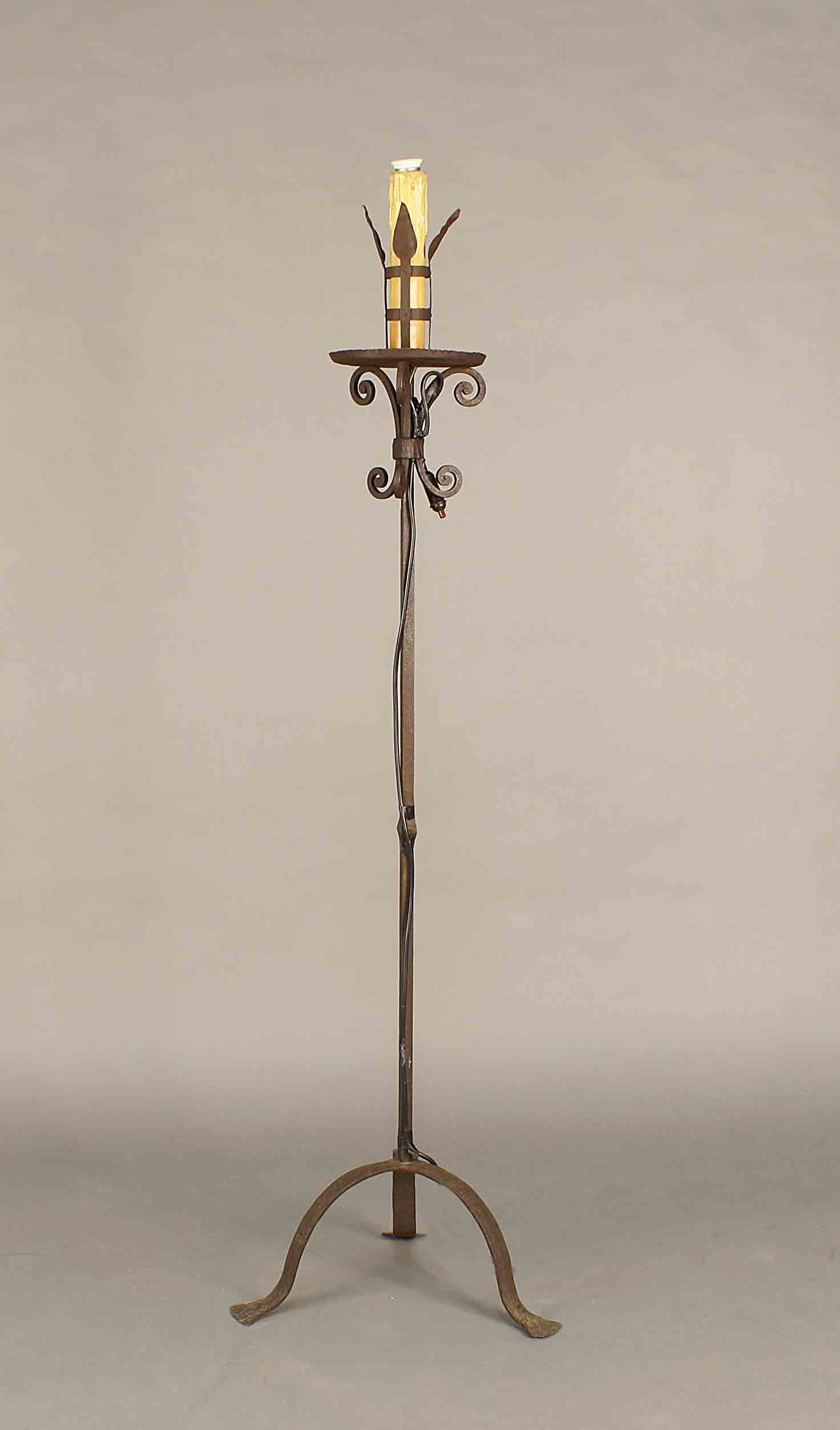 Torciere elettrificato in ferro battuto poggiante su piede a tripode, XIX secolo, h. cm. 158.