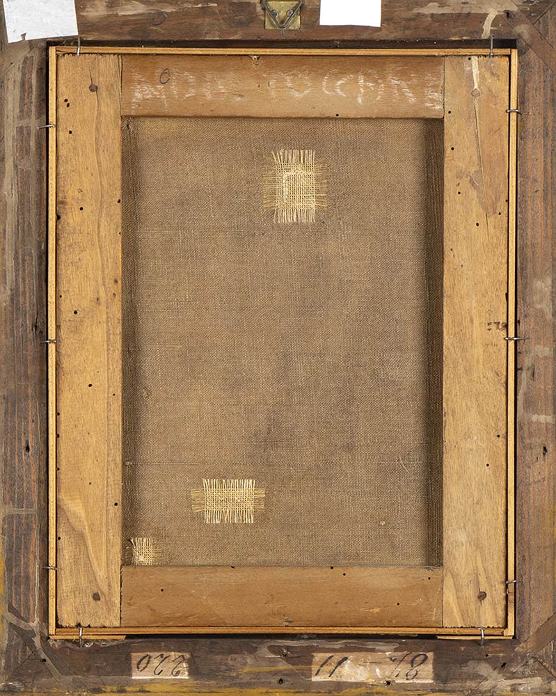 Buone condizioni, cornice senza vetro; vari restauri visibili al retro