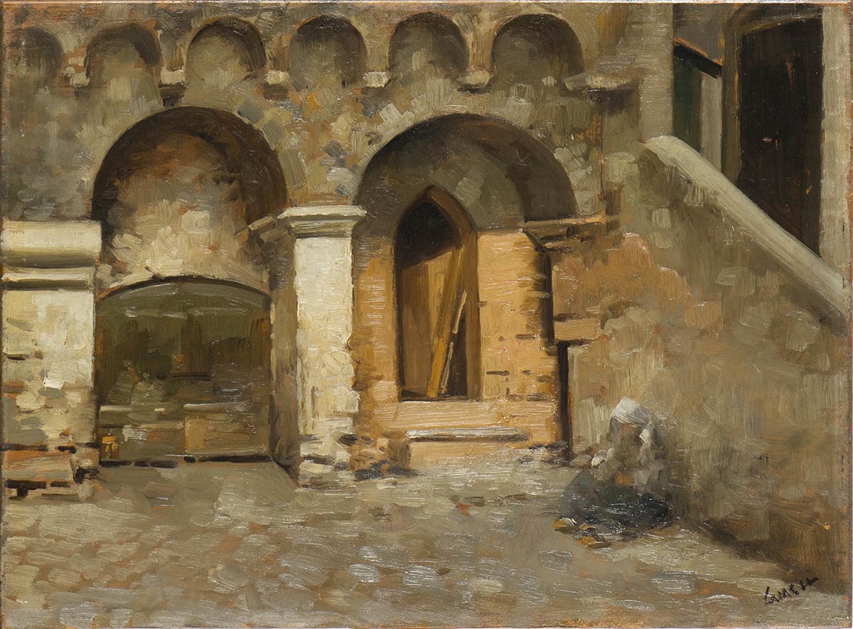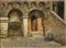 Lot 25 | TEMISTOCLE LAMESI (Roma, 1870 - 1957) : Interno di cortile con contadina