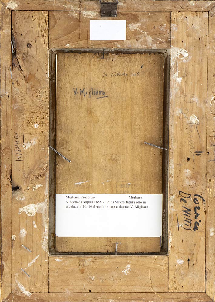 Firmato in alto a destra: Migliaro, firmato e datato al retro: V. Migliaro, 26 ottobre 1885